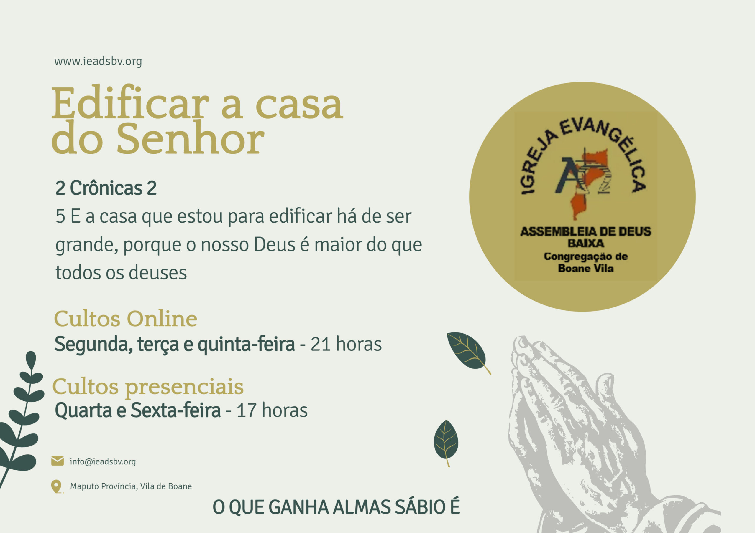 Edificar a Casa do Senhor titoslanga2012@gmail.com fevereiro 2, 2026 Nenhum comentário « Previous 1 2 3 4 5 6 7 8 9 10 Next » Igreja Envagelica Assembleia de Deus – Boane Continue confiando enquanto espera Igreja Envagelica Assembleia de Deus – Boane Edificar a Casa do Senhor Igreja Envagelica Assembleia de Deus – Boane Vida de doação e Serviço Igreja Envagelica Assembleia de Deus – Boane Consagre a Deus os Seus Planos Noticias Tudo Igreja Envagelica Assembleia de Deus – Boane CRESCIMENTO ESPIRITUAL Igreja Envagelica Assembleia de Deus – Boane Esperança em Tempos Difíceis Igreja Envagelica Assembleia de Deus – Boane Esperança em Tempos Difíceis Assine nossa newsletterEstamos a sua disposição para servir na casa do Senhor There was an error trying to submit your form. Please try again. This field is required. Subscribe There was an error trying to submit your form. Please try again. IEADSBV mais vilsualizações Igreja Envagelica Assembleia de Deus – Boane CRESCIMENTO ESPIRITUAL titoslanga2012@gmail.com março 10, 2026 Igreja Envagelica Assembleia de Deus – Boane Esperança em Tempos Difíceis titoslanga2012@gmail.com fevereiro 28, 2026 Igreja Envagelica Assembleia de Deus – Boane Esperança em Tempos Difíceis titoslanga2012@gmail.com fevereiro 25, 2026 Igreja Envagelica Assembleia de Deus – Boane Continue confiando enquanto espera titoslanga2012@gmail.com fevereiro 16, 2026 Mantem-se conectados @I@IgrejaEnvagelicaBoaneVila2+ Followers @@IgrejaEnvagelicaBoaneVila2+ Subscribers IEADSBV Podcast Ouça o podcast diário de notíciasMantem-se conectados Siga-nos
